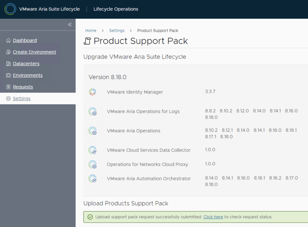 In this guide i will go over the manual steps of getting an existing 8.x Aria Suite Lifecycle appliance to support the latest product releases available. Here is a great blog that goes in to the details about what the Product Support Pack is https://blogs.vmware.com/management/2019/01/vrslcm-pspak.html. Typically the newer Product Support Pack is included part of the upgrade for Aria Suite Lifecycle, however sometimes there are product releases in between releases where product support packs come in handy. As of 8.16.0 Product Support Pack 4 we can no longer automatically download the Product Support Pack files. The release notes can be found here.