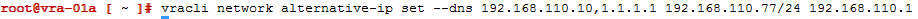 vracli network alternative-ip set --dns <DNS_IP1>,<DNS_IP2> <New_IP>/<subnet> <Gateway_IP>