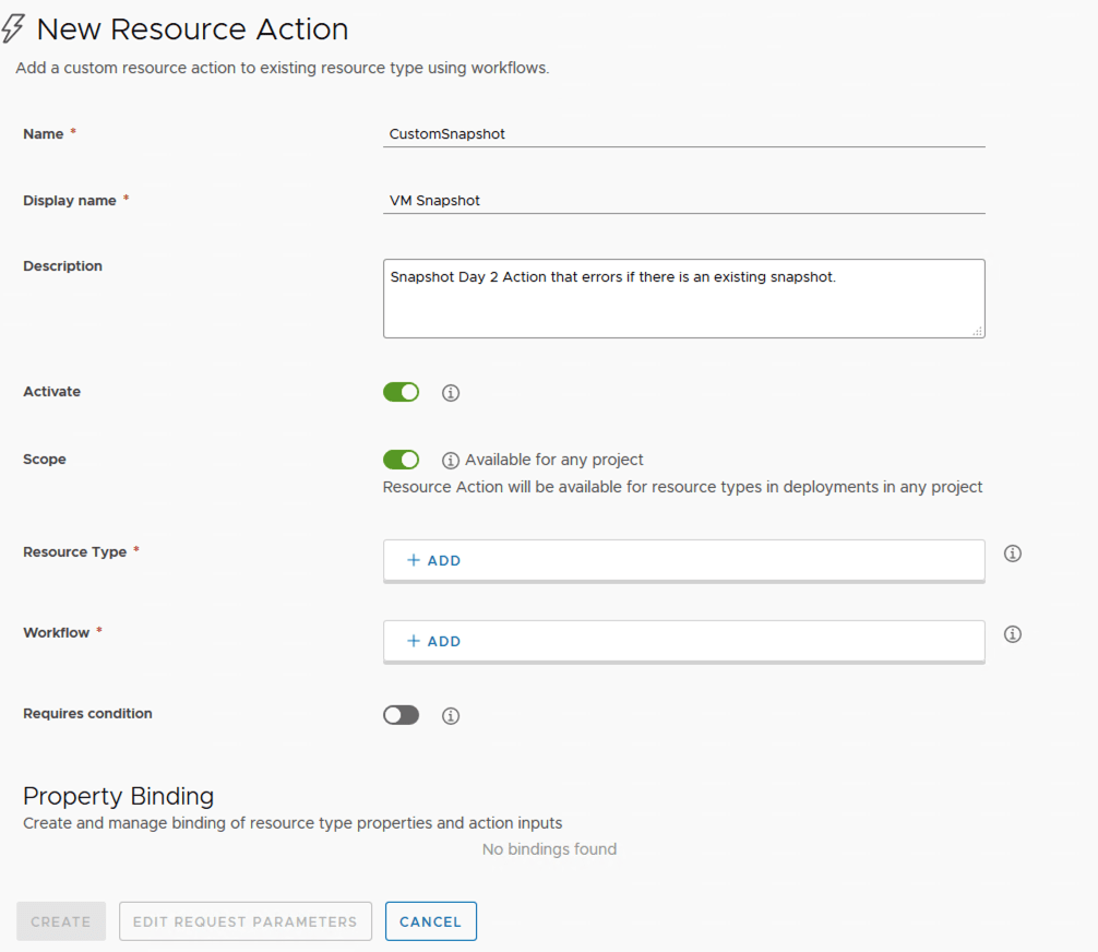 For the purpose of this i will be using a customer workflow in Orchestrator and Resource Actions and in Cloud Assembly.