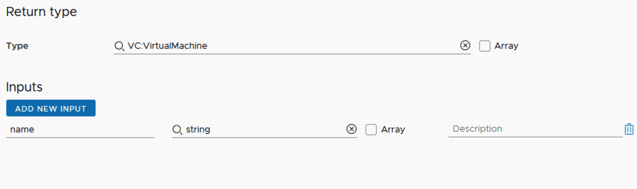 Under the Return type enter VC:VirtualMachine. Under the Inputs type in name and click Create on the bottom left