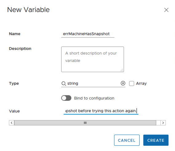 Click on New, give it a title like errMachineHasSnapshot and a value thatw ill displayed if a VM has an existing snapshot like The virtual machine already has a snaphost. Please delete this snapshot before trying this action again. Click Create