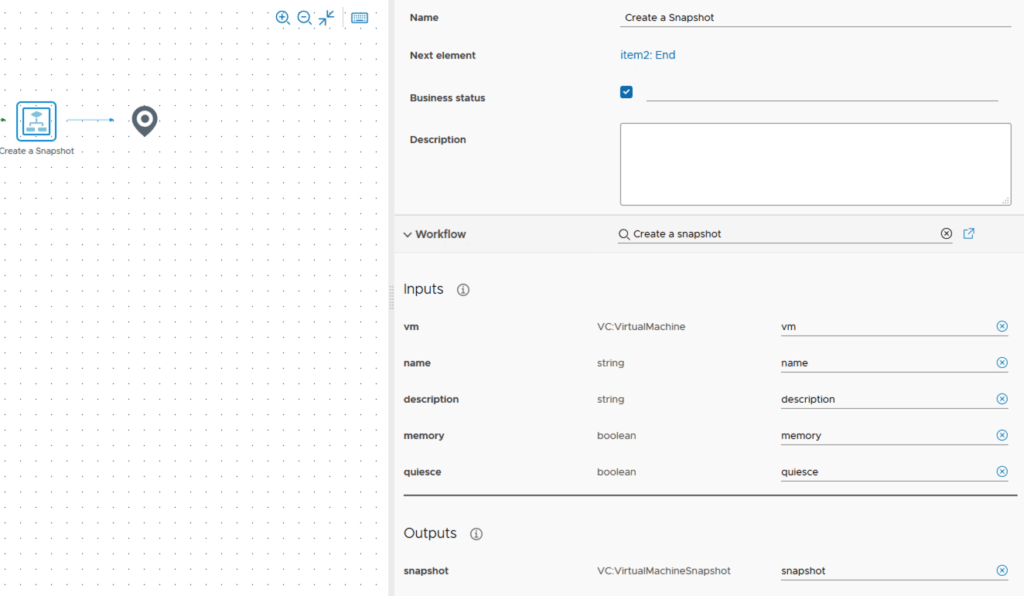 The workflow element should look like this after selecting the Workflow Create a snapshot