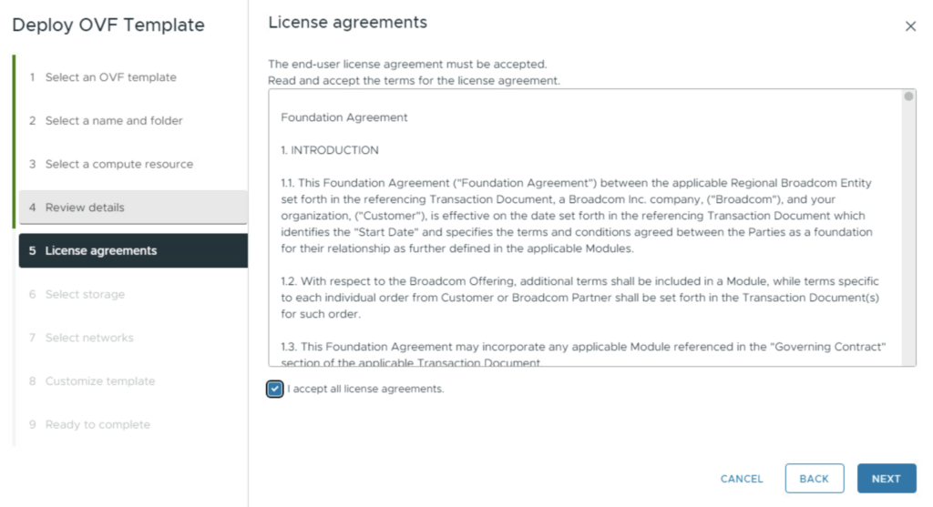 Start the Wizard: Right-click your desired cluster or host and select Deploy OVF Template. Upload the OVA file you just downloaded.