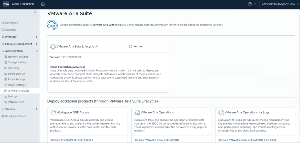 After the download is complete we can go to Administration -> VMware Aria Suite and a Deploy button should be available. If the deploy button is not available due to X-Region Application Virtual Network is not created errorplease follow the instructions found here: