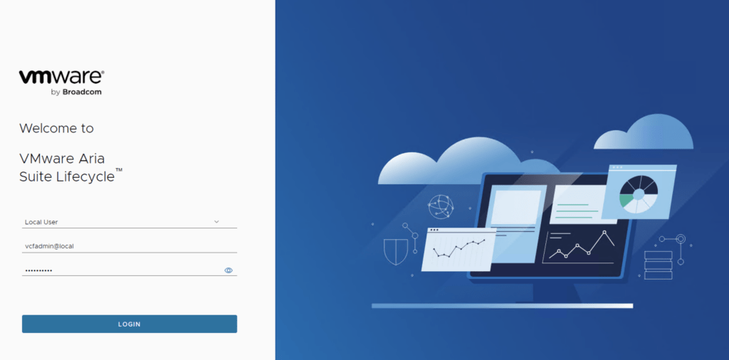 We can then log in to the Aria Suite Lifecycle using vcfadmin@local with the credentials used during the deployment.