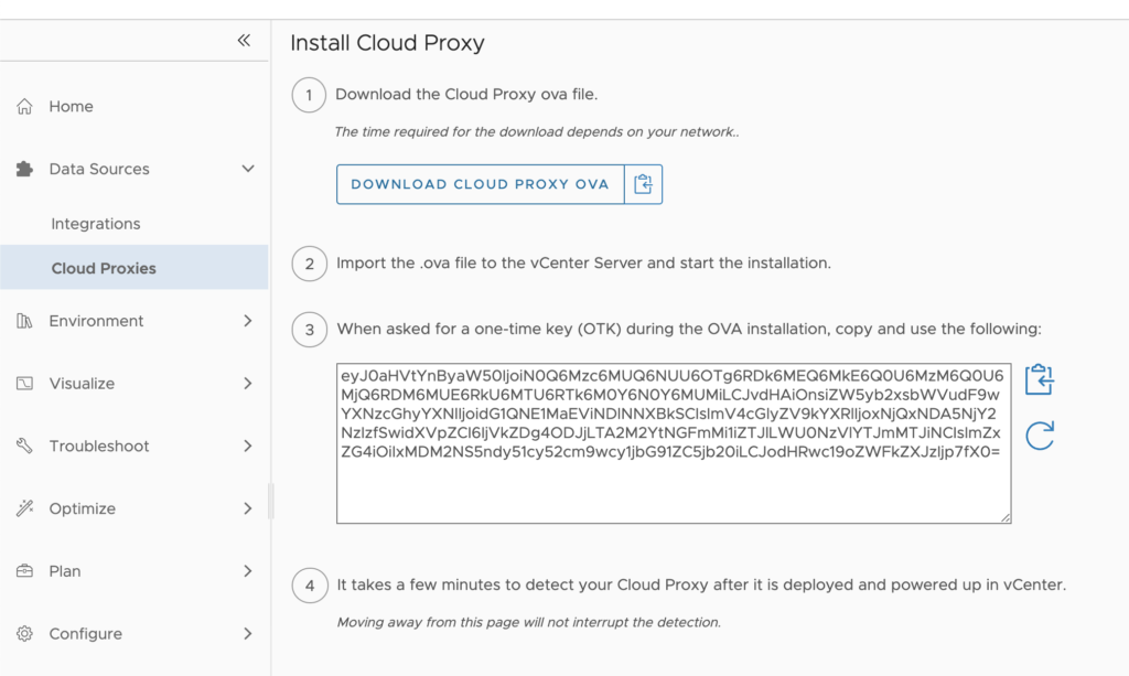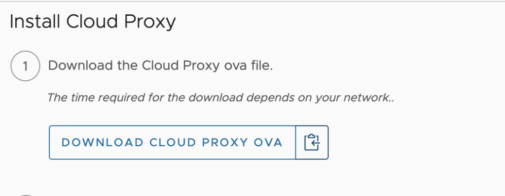 Here we can see the download cloud proxy OVA option as well as a copy button. We can also see the OTK key. Keep a note of this as we will need it during the deployment. The first step is do get the proxy deployed. by either downloading the OVA or by copying the url. In my case i will copy the URL.