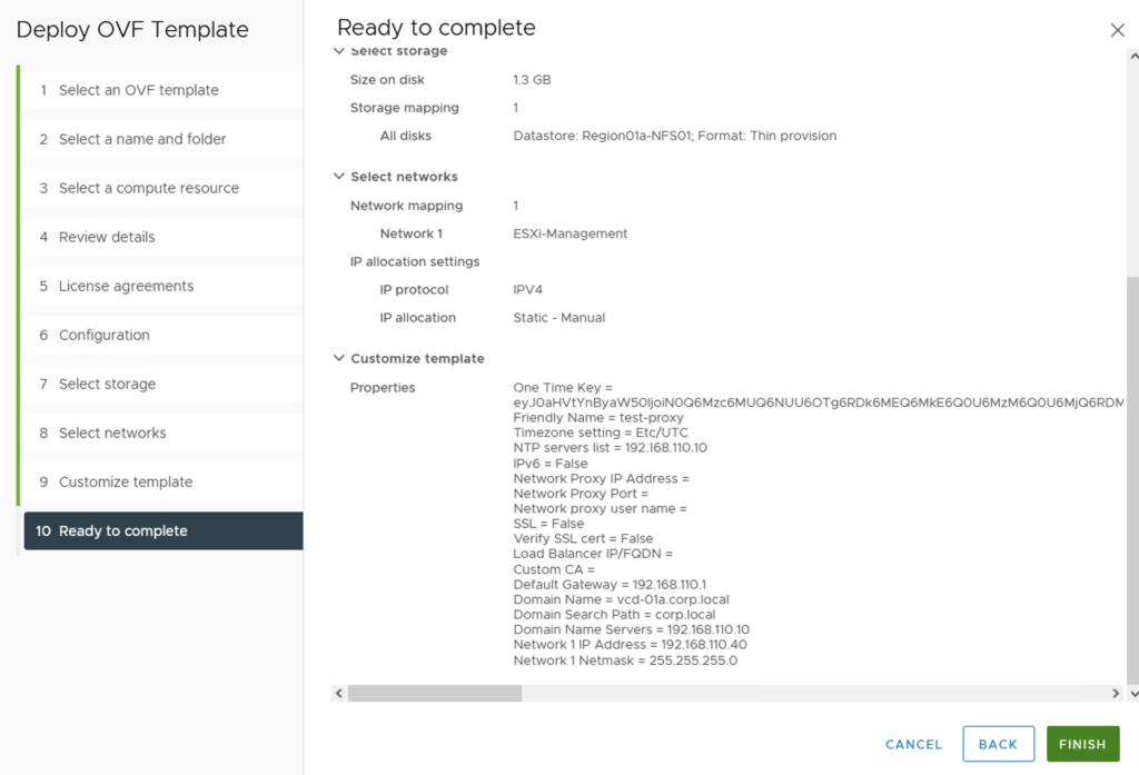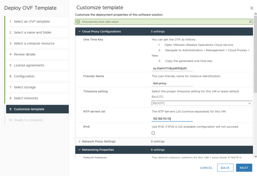 Here is where we would add that OTK key from earlier. Paste in the OTK key. Give the VM a friendly name (this name will be what`s displayed in vROPS cloud proxies page. The network Proxy Settings are only applicable if you need to use a proxy to get out to the internet. The rest of the fields should be pretty self explanatory