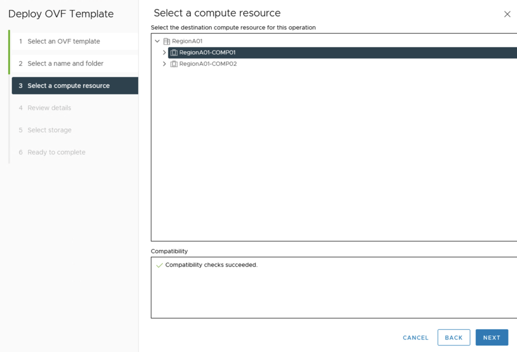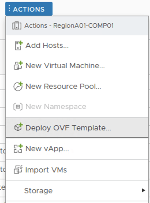Next we will go to our vCenter to get it deployed. Go to one of the hosts or clusters, then go to actions -> Deploy OVF Template… example: