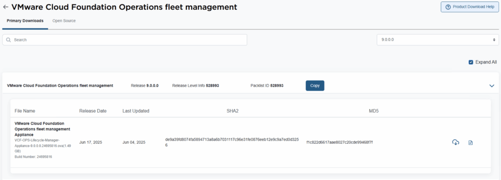 - Log into the Broadcom Support Portal and obtain the required binaries and OVA files for the Fleet Manager. Direct link can be found here.