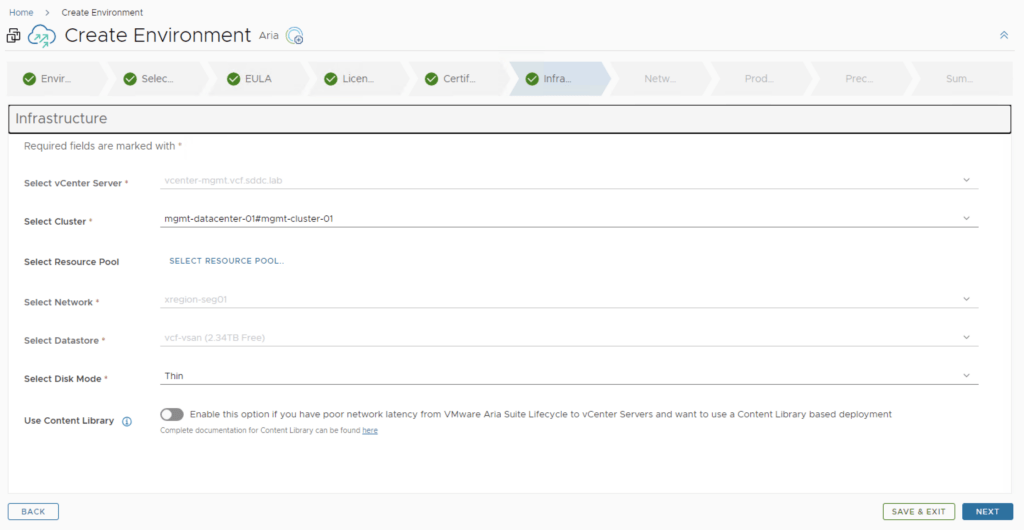 - From the Infrastructure tab, review the information. As we can see most of the fields are pre filled because we are deploying in VCF mode.