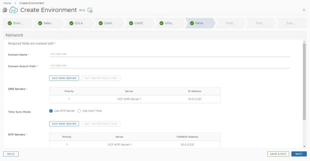 - Most of the settings for the network should be pre filled because of the VCF mode.
