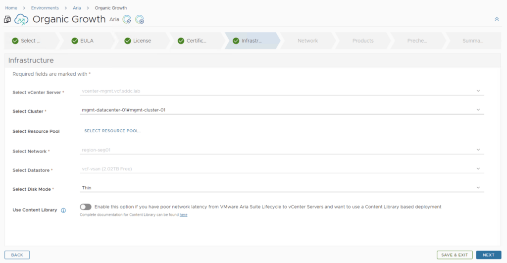 - From the Infrastructure tab, review the information. As we can see most of the fields are pre filled because we are deploying in VCF mode.