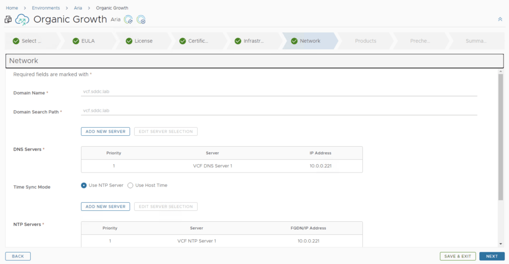 - Most of the settings for the network should be pre filled because of the VCF mode.