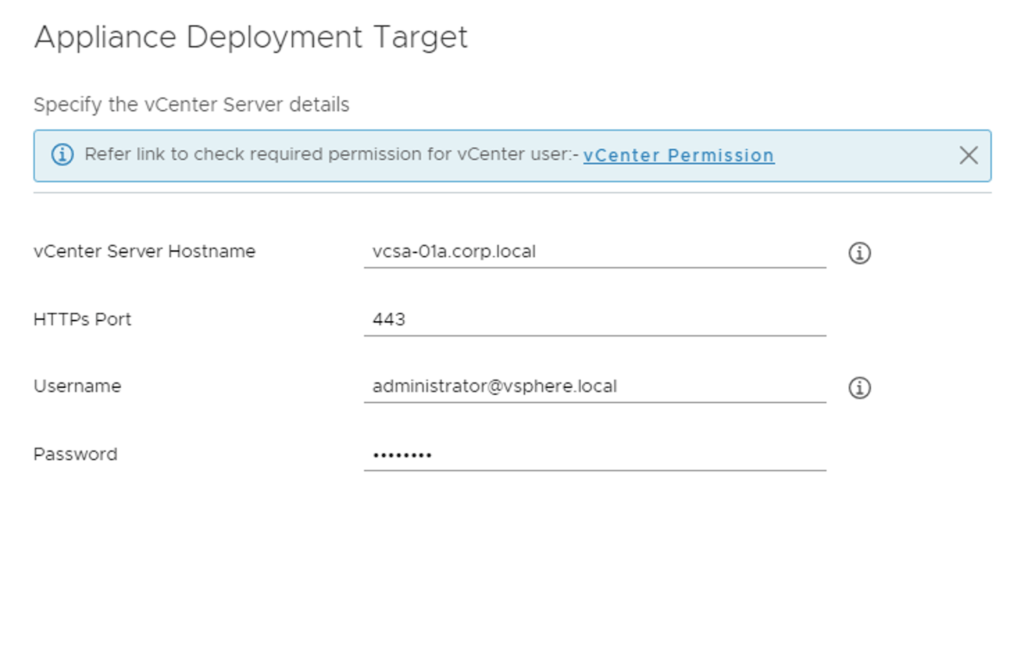 Provide the vCenter details and click next. In my case i used the administrator account. A detailed list of permissions needed for deployment can be found here