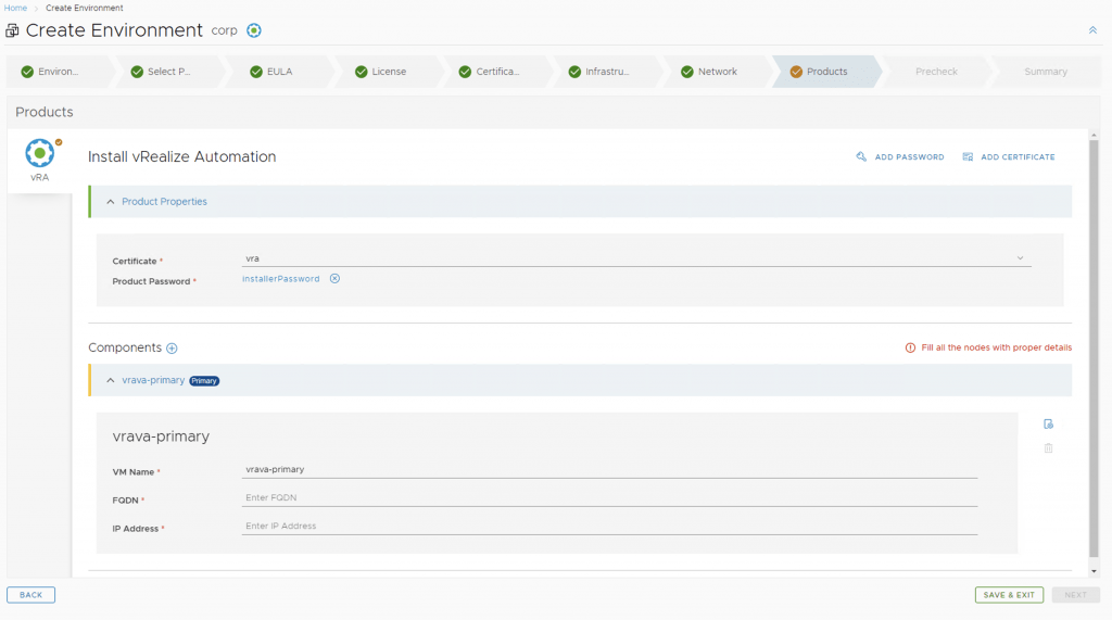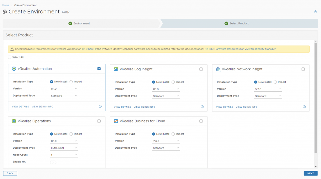 Select vRealize Automation, select the version and install type then click next
