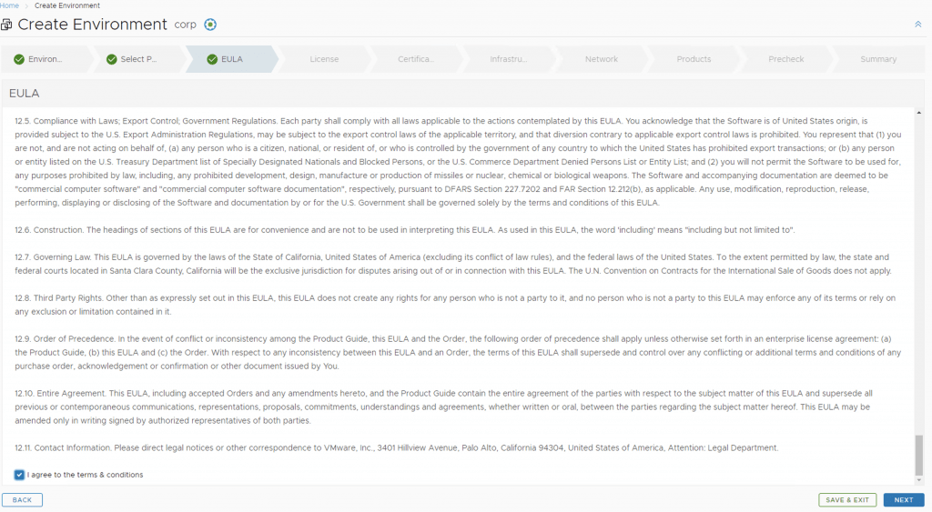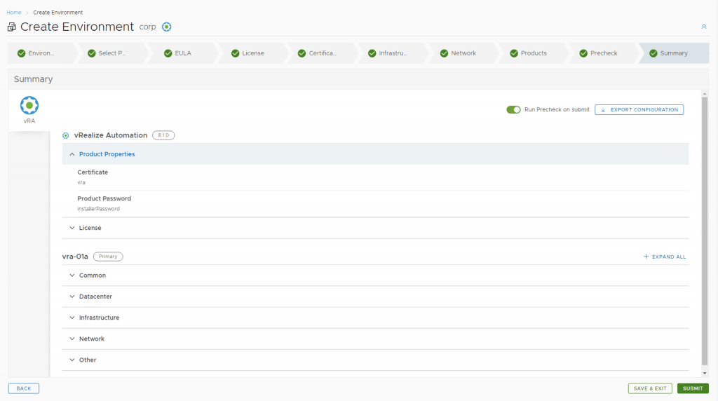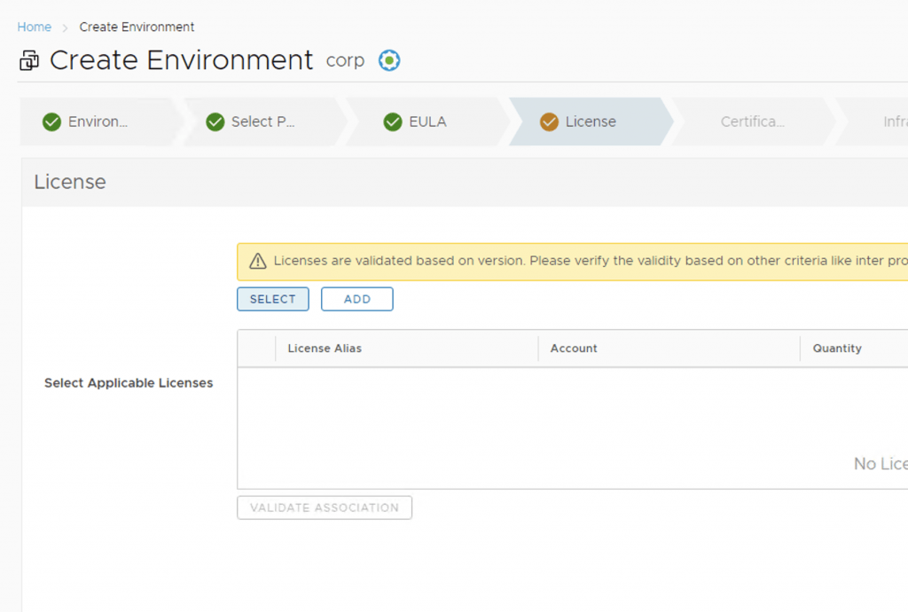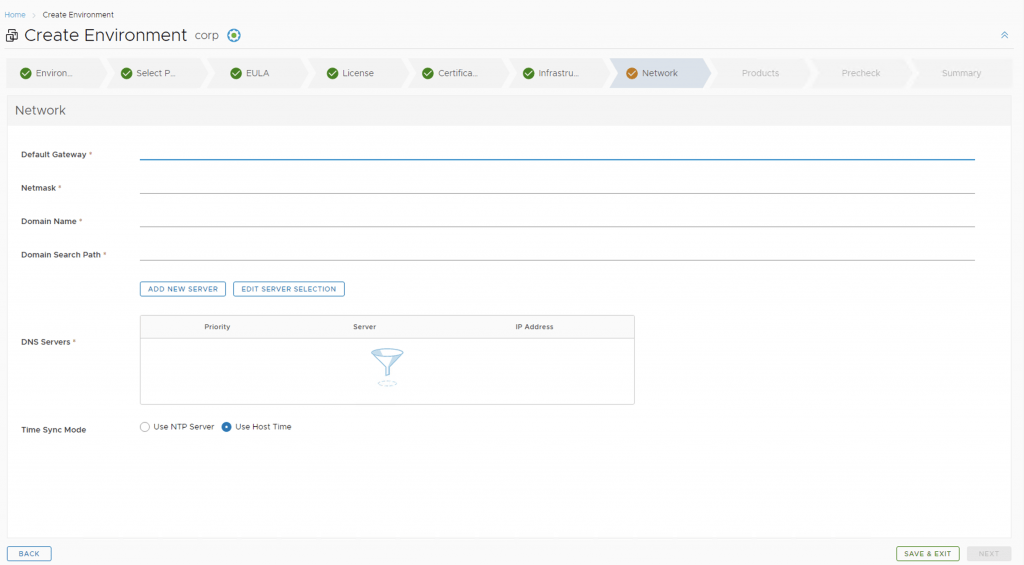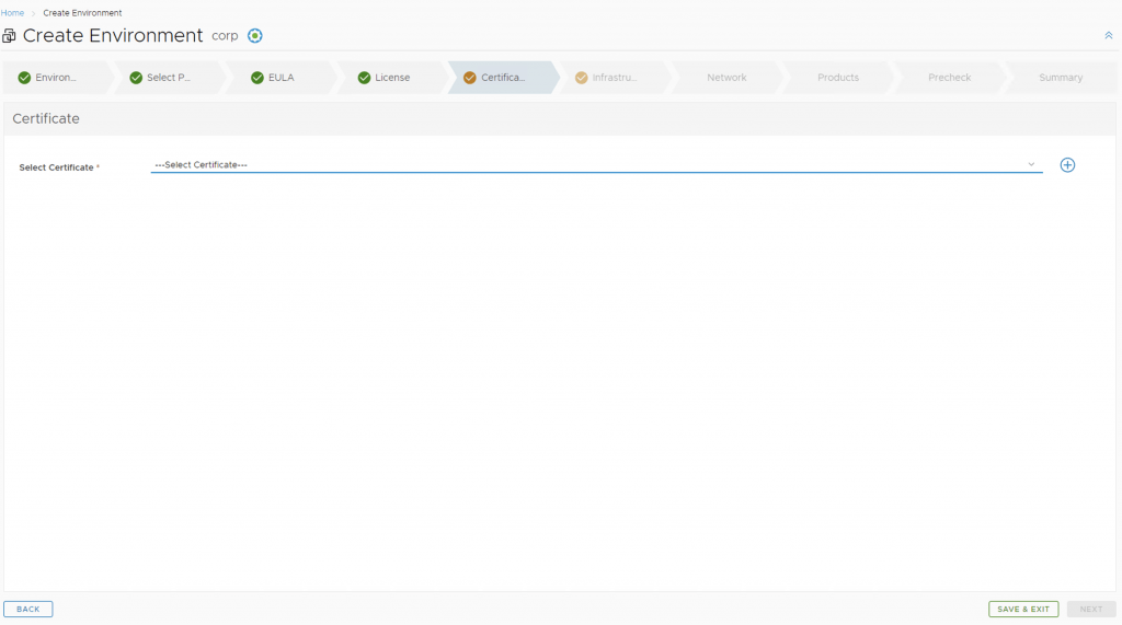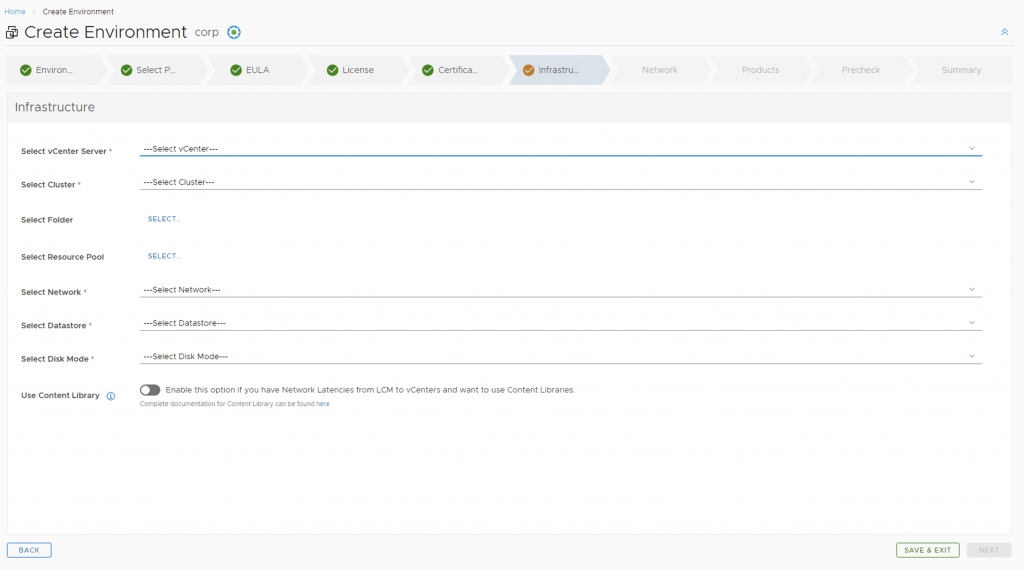Next, we need to create a new environment that will be used to deploy vRA. For this we can go to Lifecycle Operations -> Create Environment. Fill in the necessary information and click next