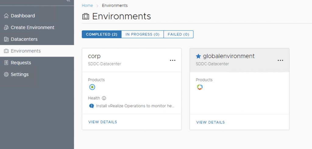 If we go to environments we can see that the vRA Environment