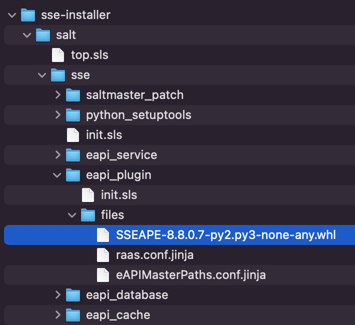Once Downloaded we are looking for SSEAPE-8.8.0.7-py2.py3-none-any.whl found under sse-installer/salt/sse/eapi_plugin/files