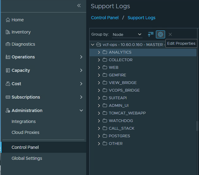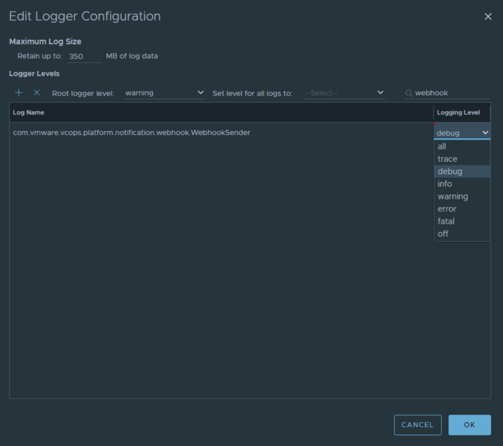 Crucial Step: Once you have identified and resolved the issue, remember to return to the Support Logs settings and set the logging level for com.vmware.vcops.platform.notification.webhook.WebhookSender back to INFO or remove the class configuration entirely. Leaving DEBUG logging enabled can lead to rapid disk consumption and potential performance degradation in the Analytics node.
