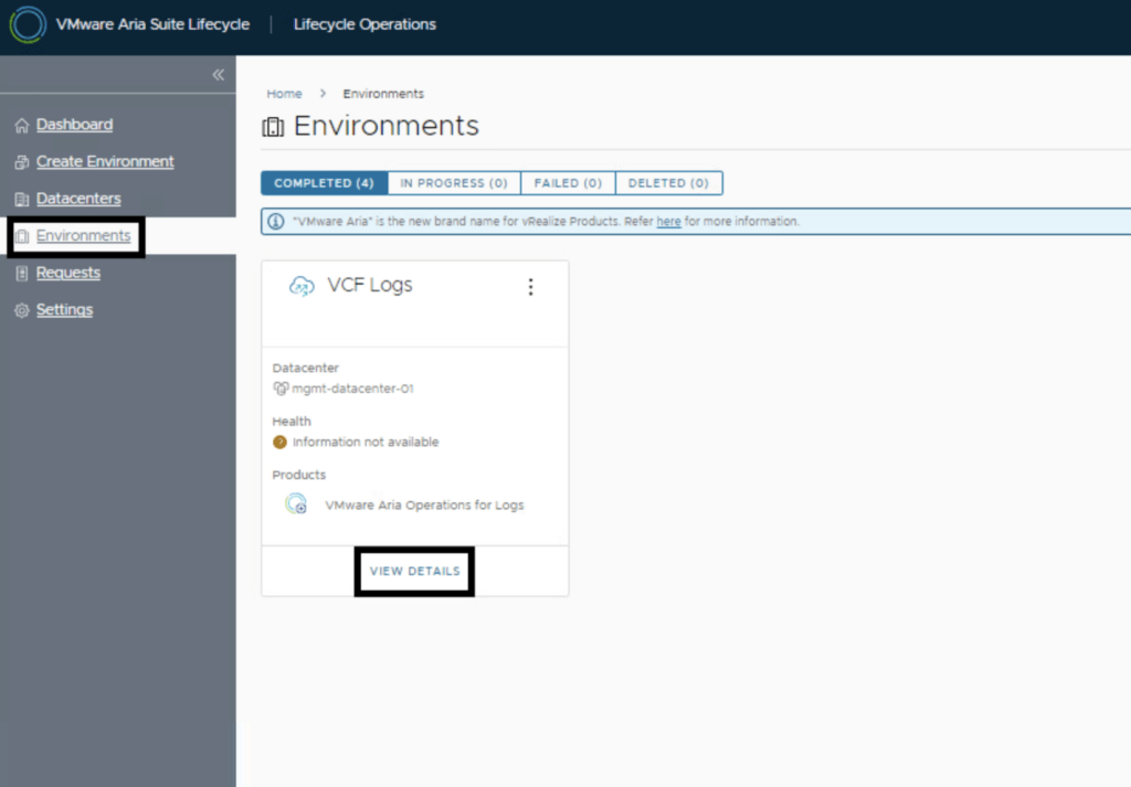 After the download is complete we can go to Environments -> View Details on the environment that includes Aria Operations