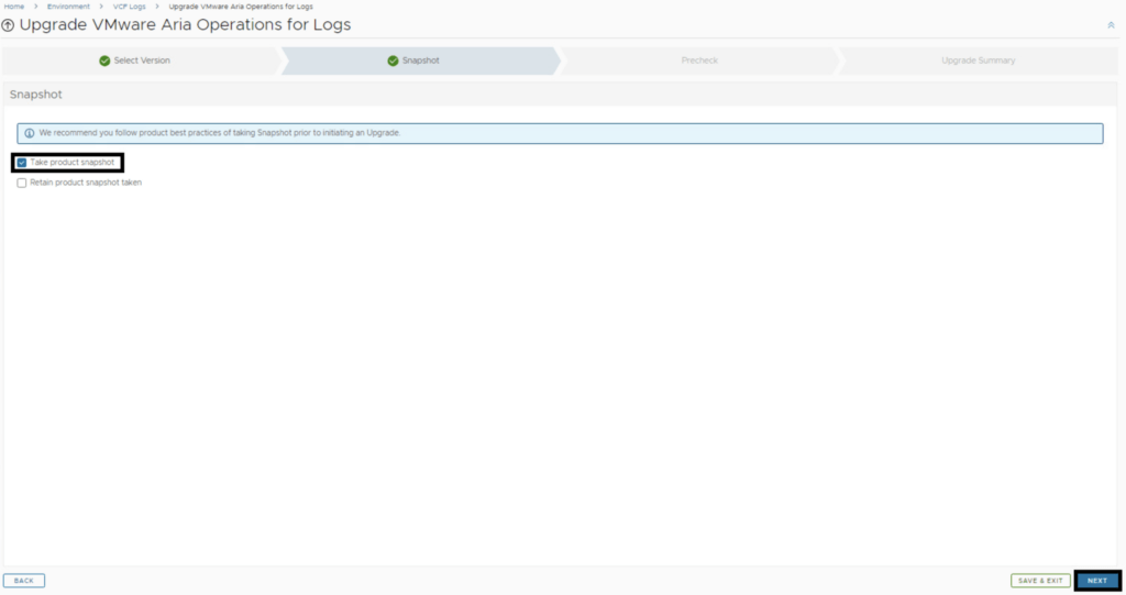 A new feature that was added was the capability to automatically create a snapshot prior to the upgrade and remove it after the upgrade. On this screen we also have the ability to choose if we want to keep the snapshots post upgrade for validation testing for example. Click Next