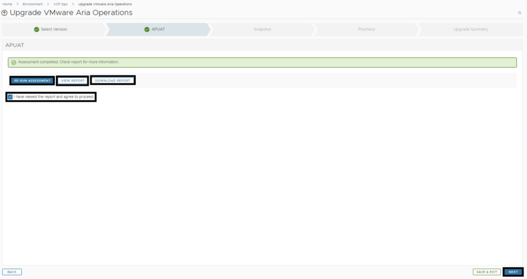 A new feature that was added was the capability to automatically create a snapshot prior to the upgrade and remove it after the upgrade. On this screen we also have the ability to choose if we want to keep the snapshots post upgrade for validation testing for example. Click Next