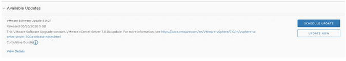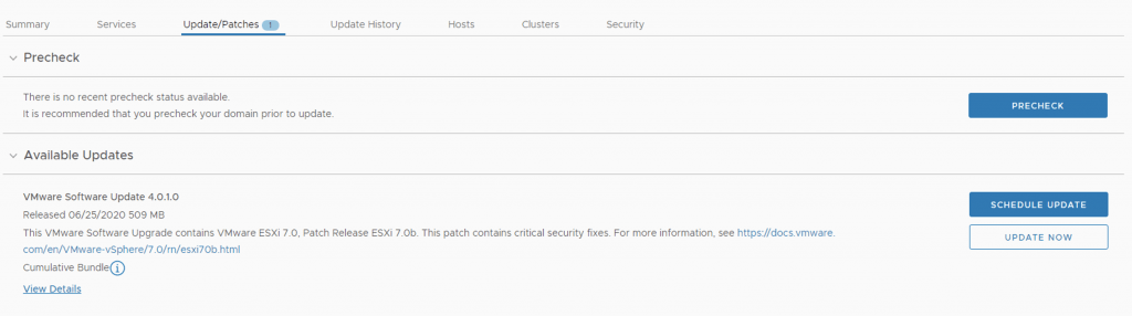 Next next step is to upgrade the vCenter server to 7.0.0b. We can go to Inventory -> Workload Domains -> Select the workload domains -> Update/Patches Under available updates there should be a VMware Software update 4.0.1.0. Click on Download Now followed by Update Now