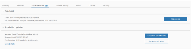 The last step for the management domain is to apply the configuration drift bundle. Go to Inventory -> Workload Domains -> Select the management domain -> Update/Patches. Under the Available updates there should be a Configuration drift bundle for 4.0.1 update. Click on Download now