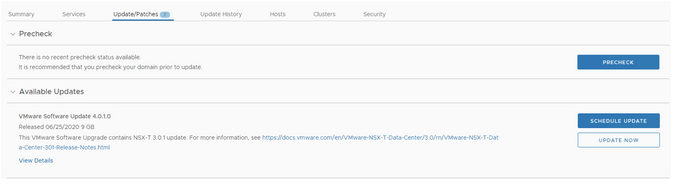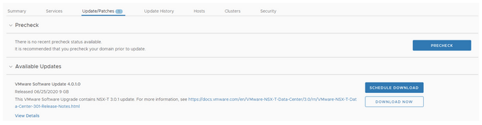 Going to Inventory -> Workload Domains -> Management Domain -> Update/Patches reveals that an upgrade for NSX-T 3.0.1 is available. Click on download now.