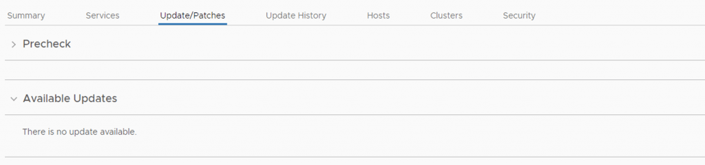 Once the ESXi servers are patched the upgrade of the management domain should be complete. We can verify this by going to Inventory -> Workload Domains -> Management domain -> Update/Patches and verify there are no updates available under the available updates section