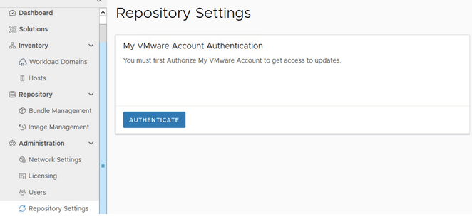 We can click directly on My VMware Account or go to Administration -> Repository Settings -> Authenticate