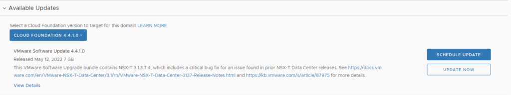 Once the edges are upgraded we an go back to Inventory -> Workload Domains -> Select the workload domain -> Update/Patches -> Under Available updates click on Update Now
