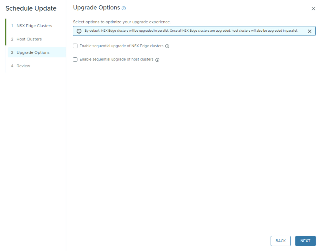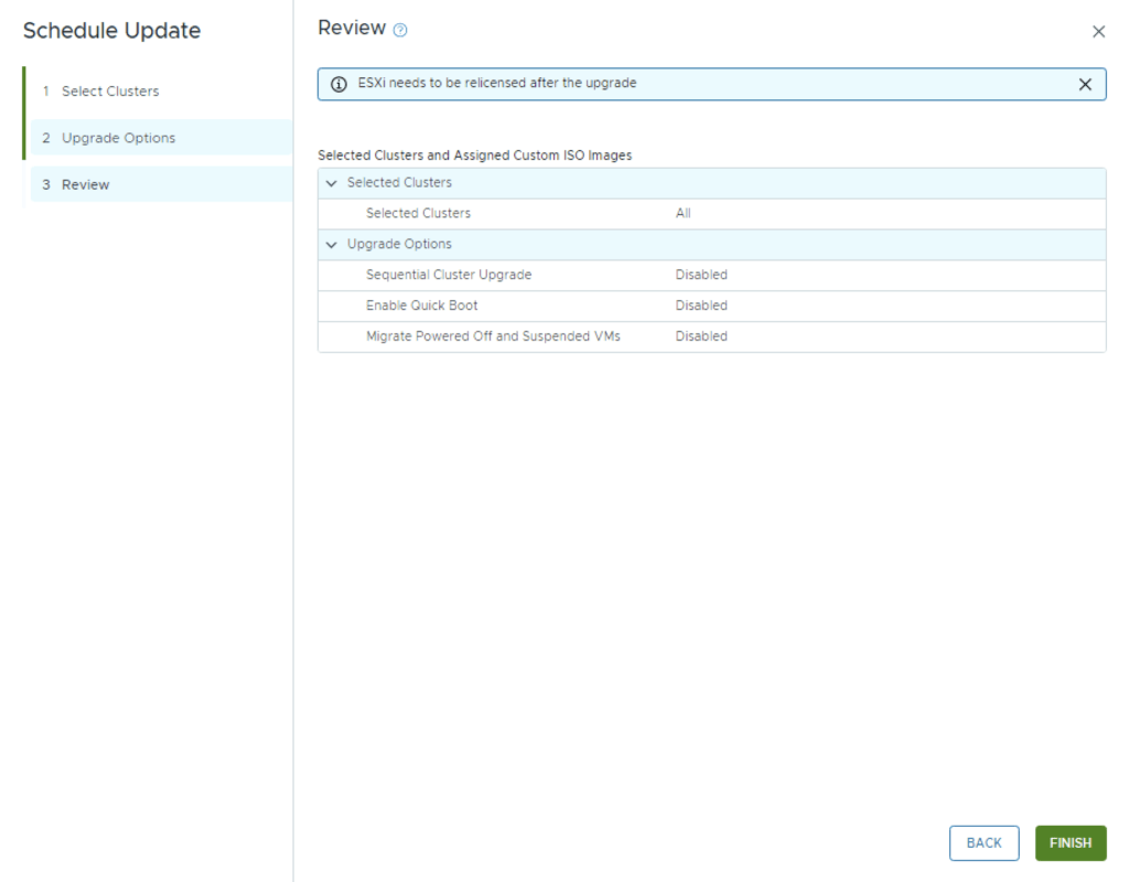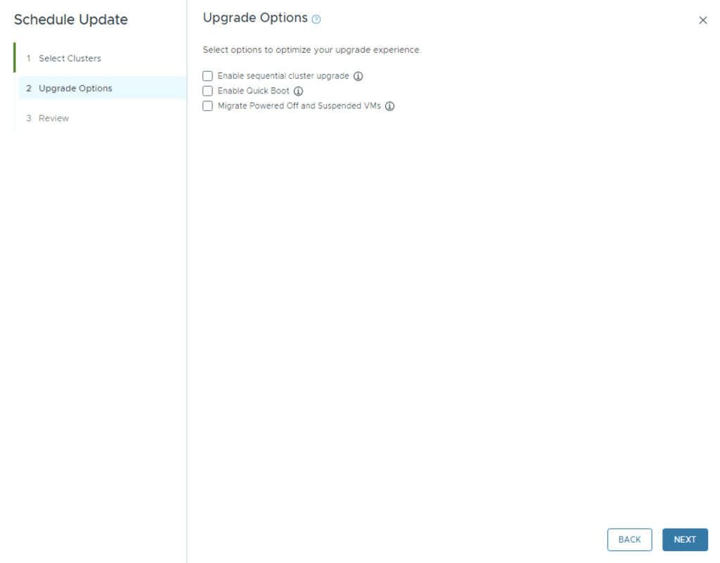 We can also enable sequential cluster upgrade, quick boot and the ability to evacuate offline VMs part of the maintenance. Click Next