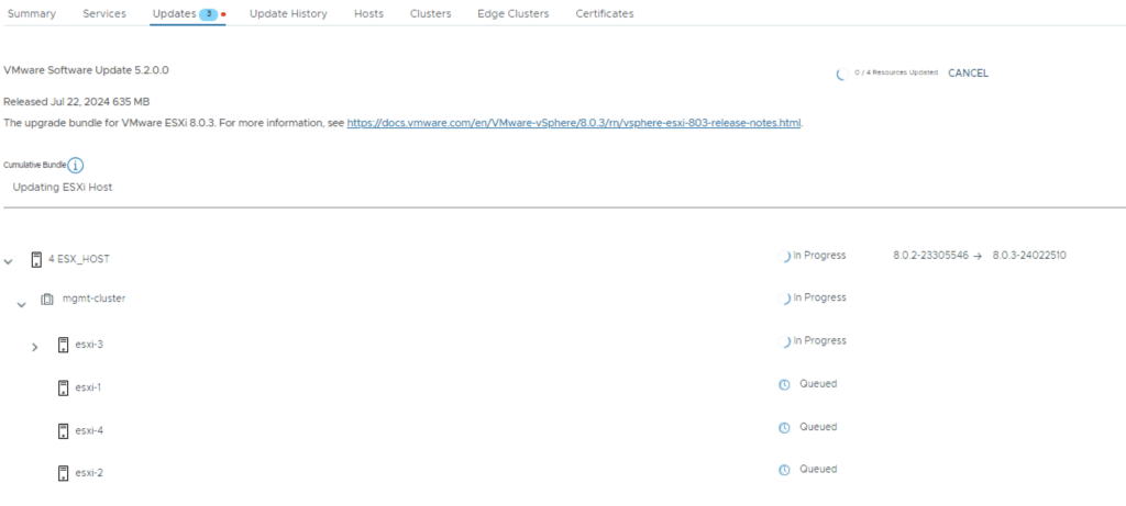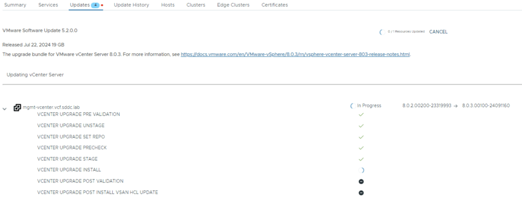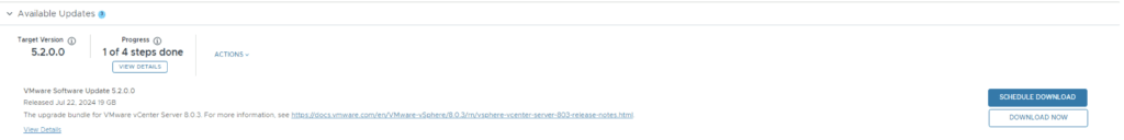 Once the upgrade is complete we can proceed with the vCenter Upgrade. VCF 5.2 comes with vCenter Server 8.0 Updated 3. The release notes can be found here. We can go to Inventory -> Workload Domains -> Select the workload domain -> Updates -> Under Available updates click on Download now.