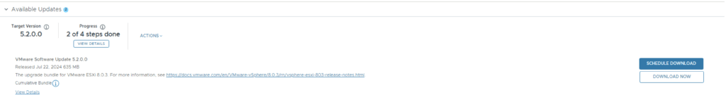 Once the upgrade is complete we are taken back to the previous page where we can see that the ESXi servers are next. The release notes can be found here. Click on Download Now.