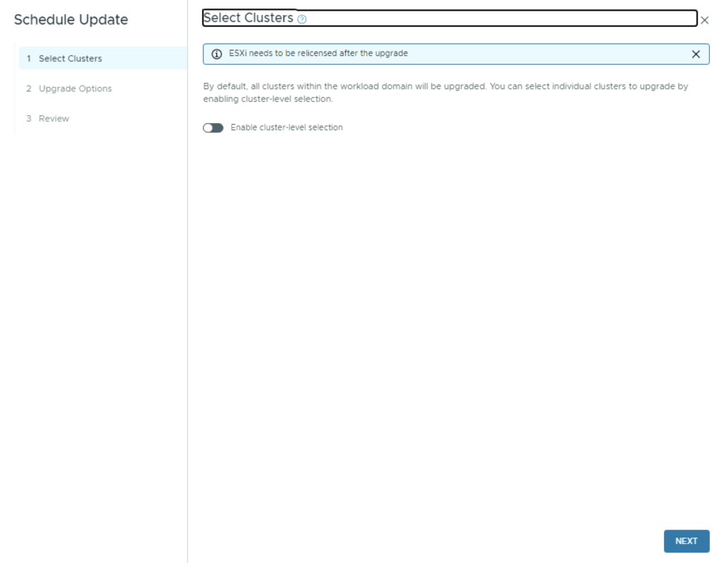 If we have multiple clusters we can enable Cluster-level selection and select the specific cluster(s) we want to upgrade.
