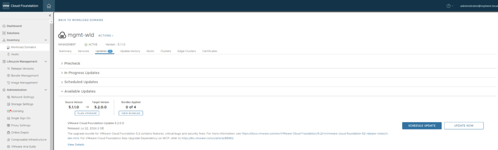 We can start by going to Inventory -> Workload Domains -> Select the domain -> Updates -> Plan Upgrade. Select VMware Cloud Foundation 5.2.0.0 -> Confirm