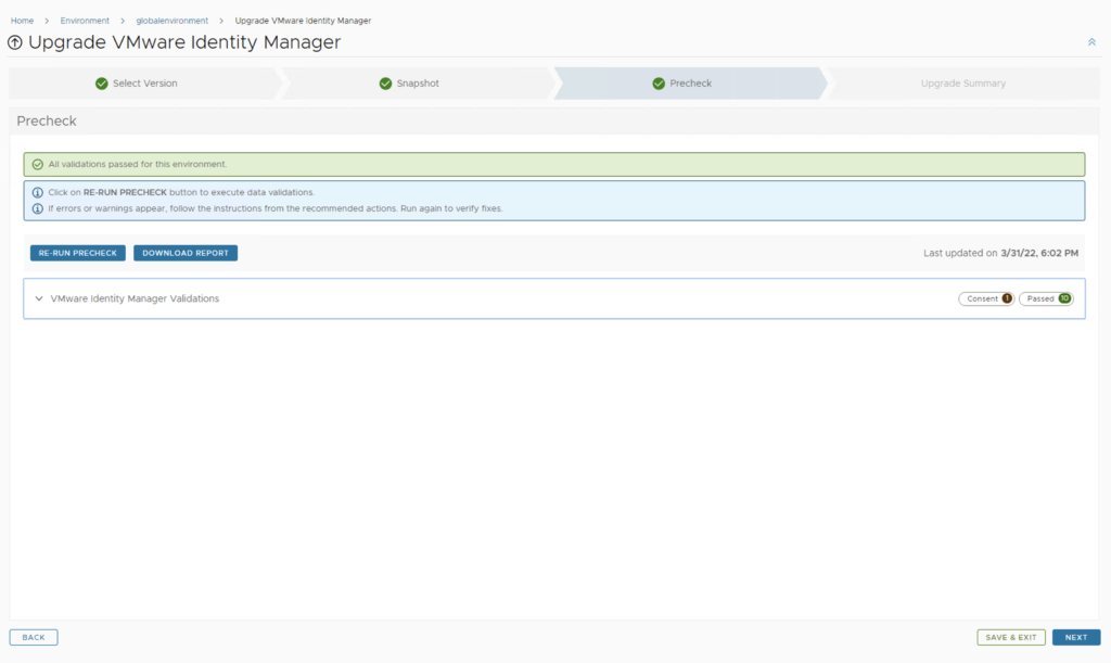 A new feature that was added was the capability to automatically create a snapshot prior to the upgrade and remove it after the upgrade. On this screen we also have the ability to chose if we want to keep the snapshots post upgrade for validation testing for example. Click next