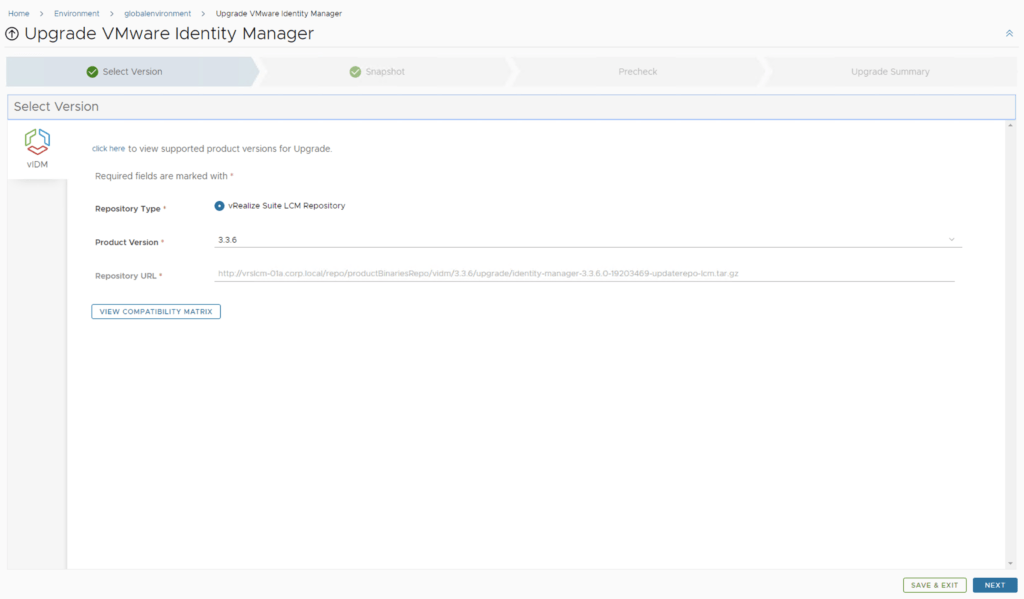 Select product Version 3.3.6 and click Next. We can also review the compatibility matrix to make sure the environment is compatible.