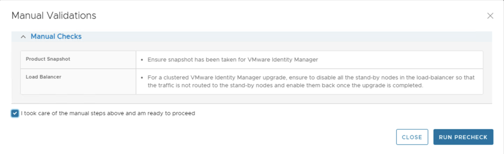 There`s a list of Manual Validations. Once verified click on I took care of the manual steps above and am ready to proceed check box and click on Run Precheck