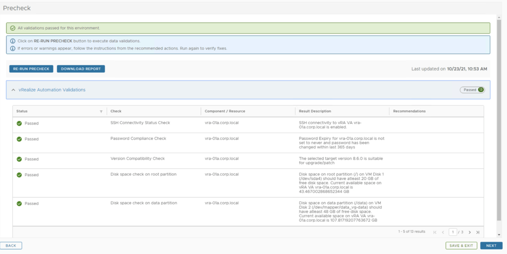 The next screen remind us of hardware requirements for vRA and vIDM which can be checked here for vRA and vIDM which can be checked here. As far as i can tell they haven’t changed since the 8.3 release. Check the I took care of the manual steps above and am ready to proceed check mark and click on Run Precheck