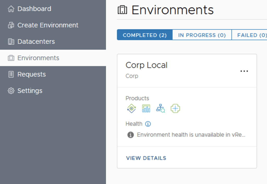 After the download is complete we can go to Environments -> View Details on the environment that includes vROPS