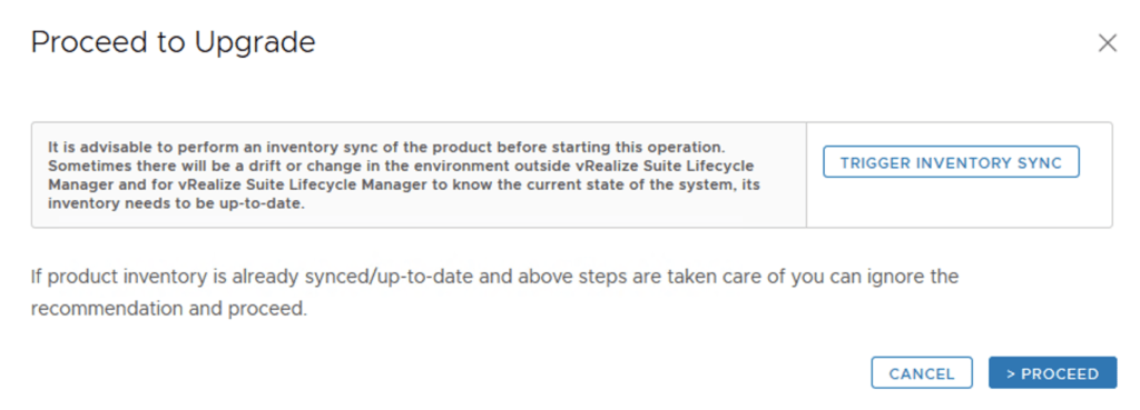 An Inventory sync is recommended if the environment has changed since LCM performed the last sync. We trigger the sync from the UI or click on Proceed to continue