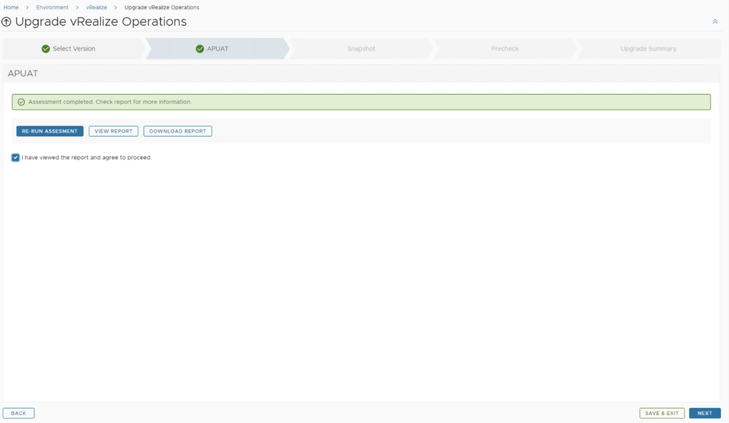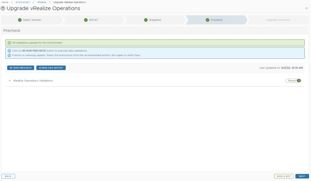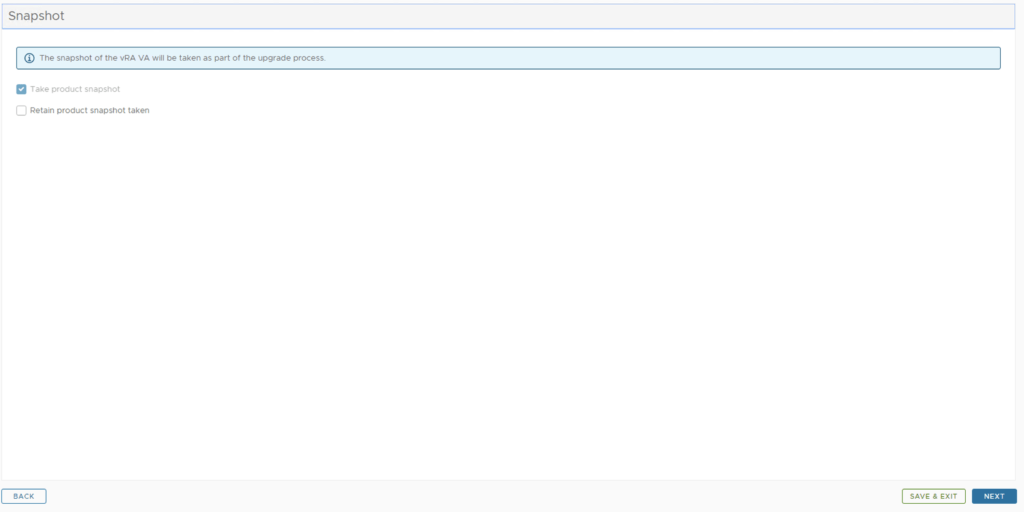 A new feature that was added was the capability to automatically create a snapshot prior to the upgrade and remove it after the upgrade. On this screen we also have the ability to chose if we want to keep the snapshots post upgrade for validation testing for example. Click next