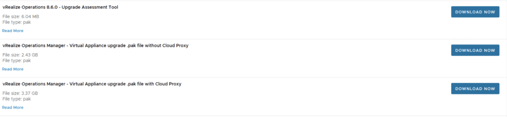 Once were at the Product Download Page we can download the .pak file under vRealize Operations Manager - Virtual Appliance upgrade .pak file with Cloud Proxy. I also strongly recommend to download the vRealize Operations 8.6.0 - Upgrade Assessment Tool in order to make sure that everything is in order to get a successful upgrade. The Upgrade assessment tool checks for a number of items like dashboards, views, reports etc which can be impacted by metric changes (if any), however it is optional.