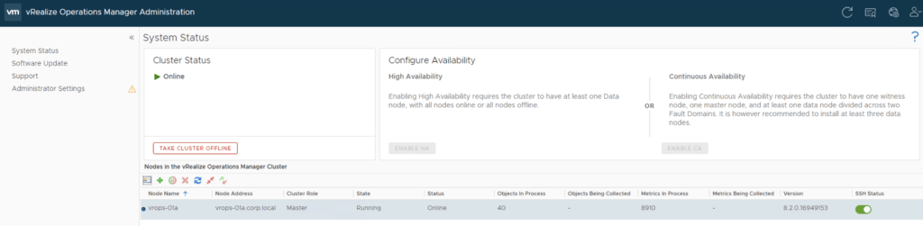 Once we have the downloads completed we can go to https://vrops_url/admin and log in with the admin username\password. Make sure the System Status shows Online and everything is running.