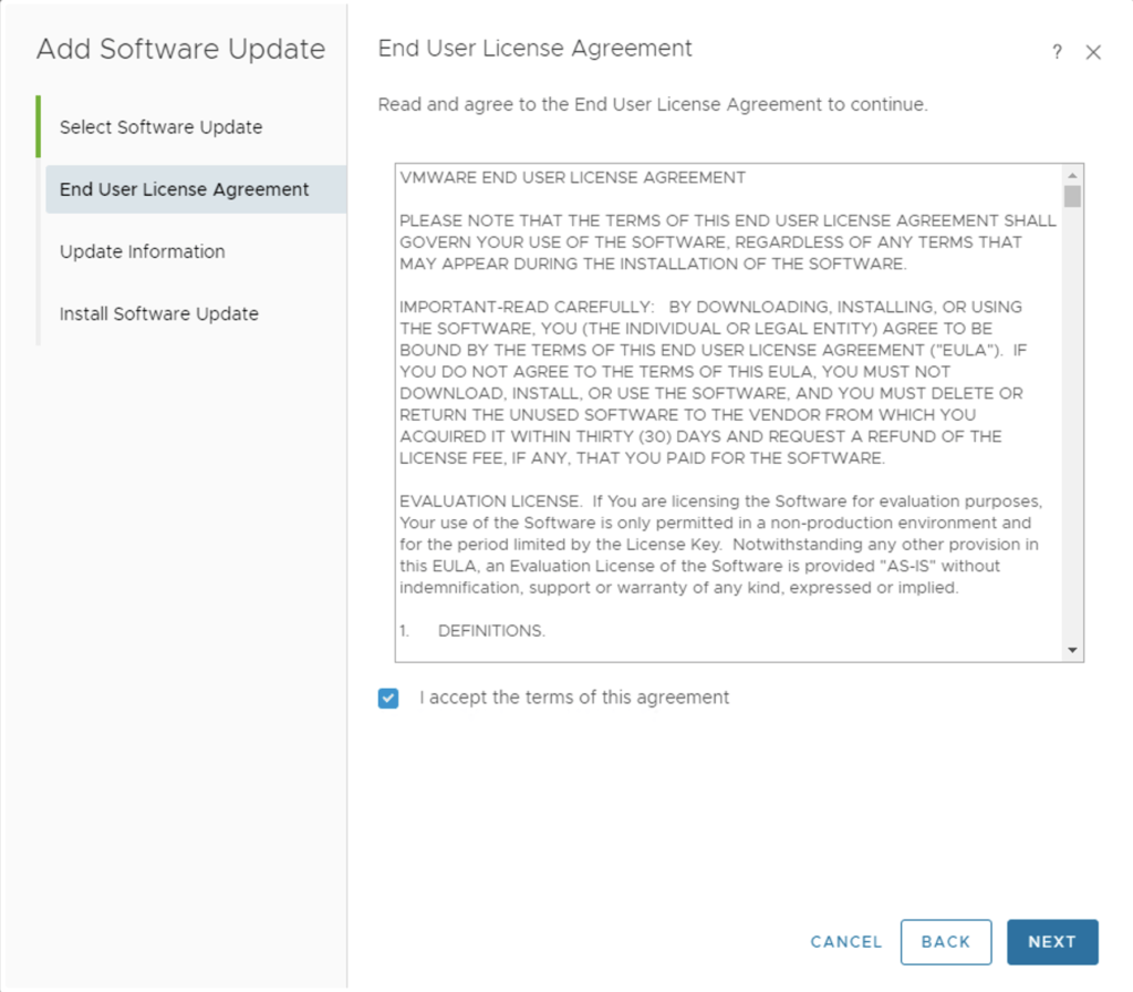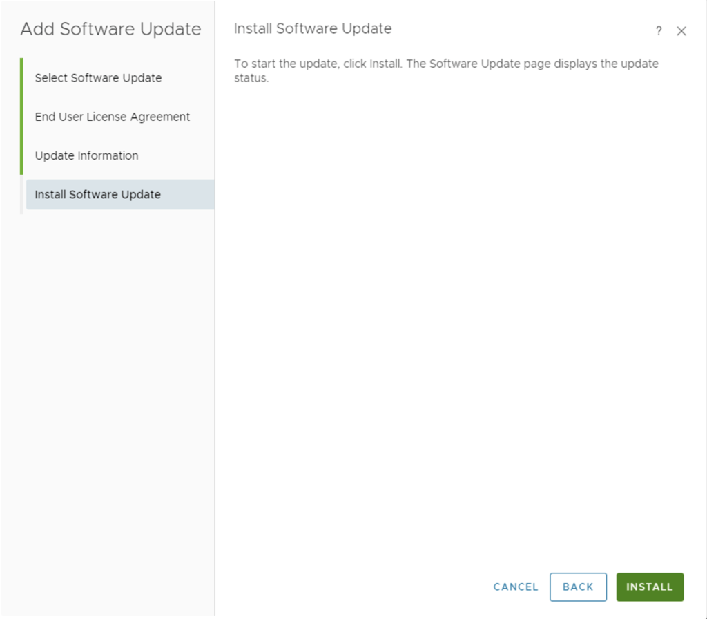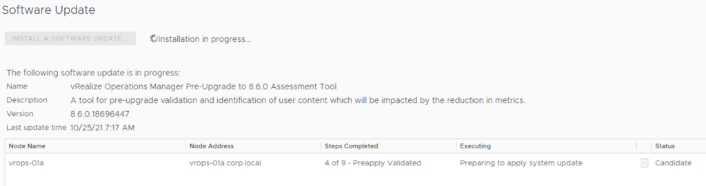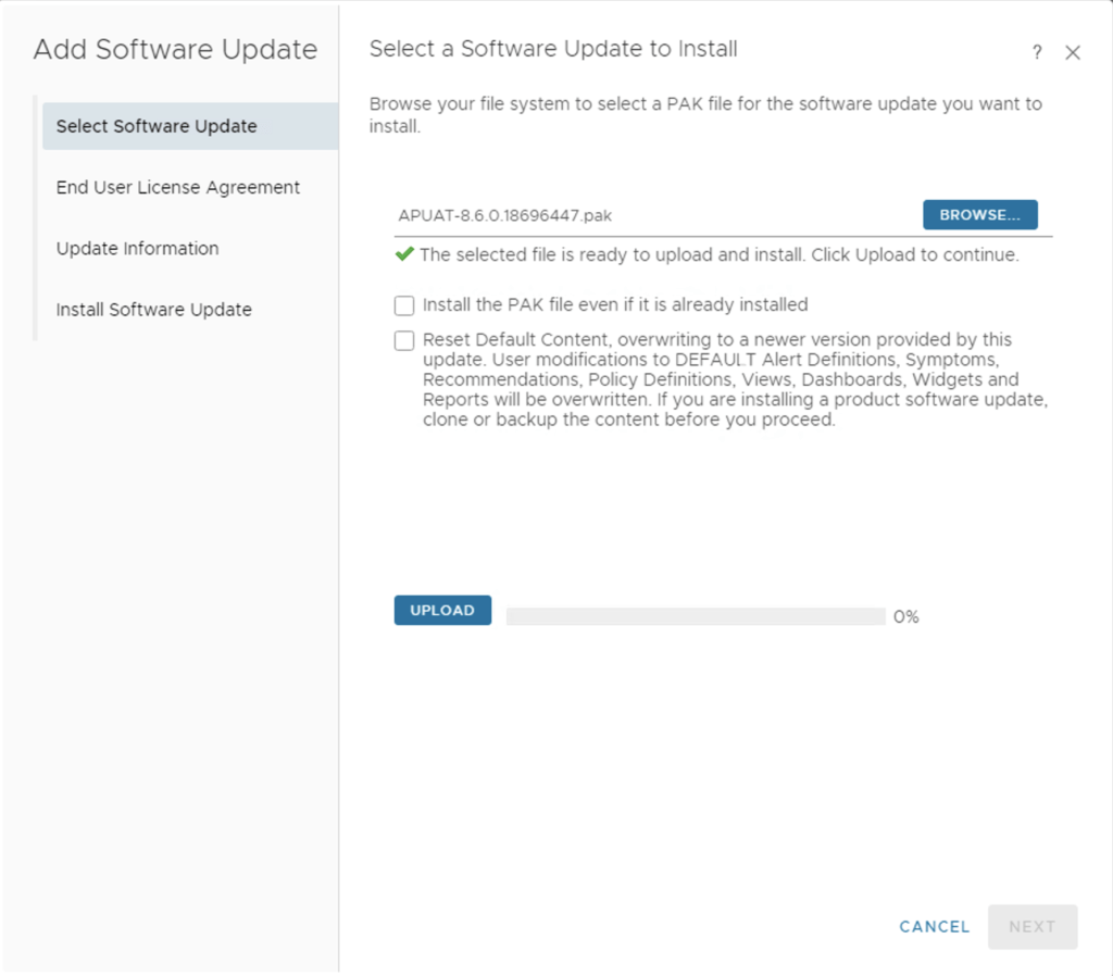 If everything looks good we can return to the admin UI and upload the product upgrade package under Software Update -> Install a software update -> Brose to the downloaded .pak file -> Click on Upload to stage the package -> Click on Next. Follow the rest of the screens till we click submit.
