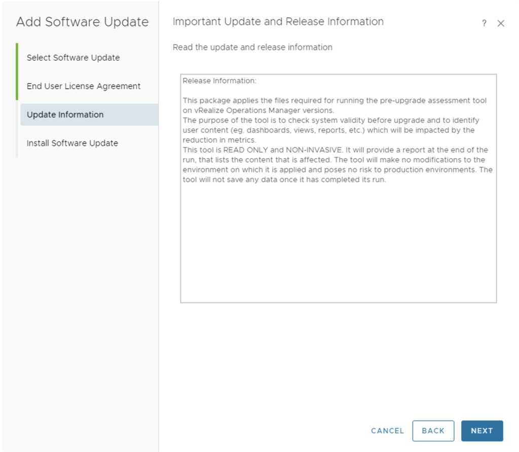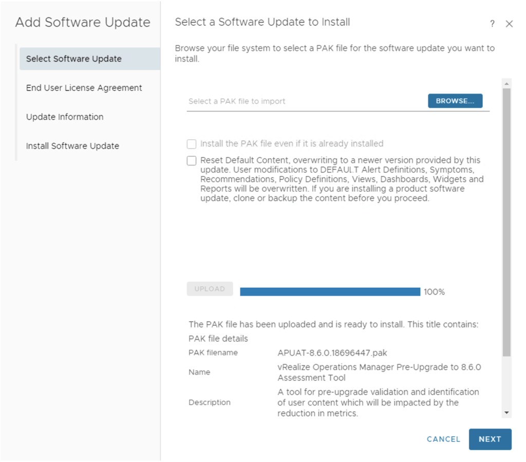 The upload button will stage the package on the vROPS server. We can review the details and click on Next