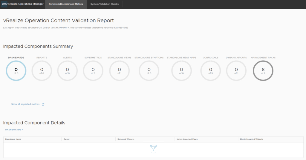 eport folder and open the index.html. Here we can review Removed\Discontinued Metrics, Dashboards that might be effected as well as a number of system validation checks.