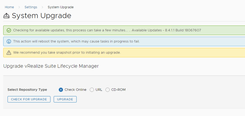 In this guide i will go over the steps of getting an existing 8.x vRSLCM appliance upgraded to the latest 8.4 release. The release notes can be found here